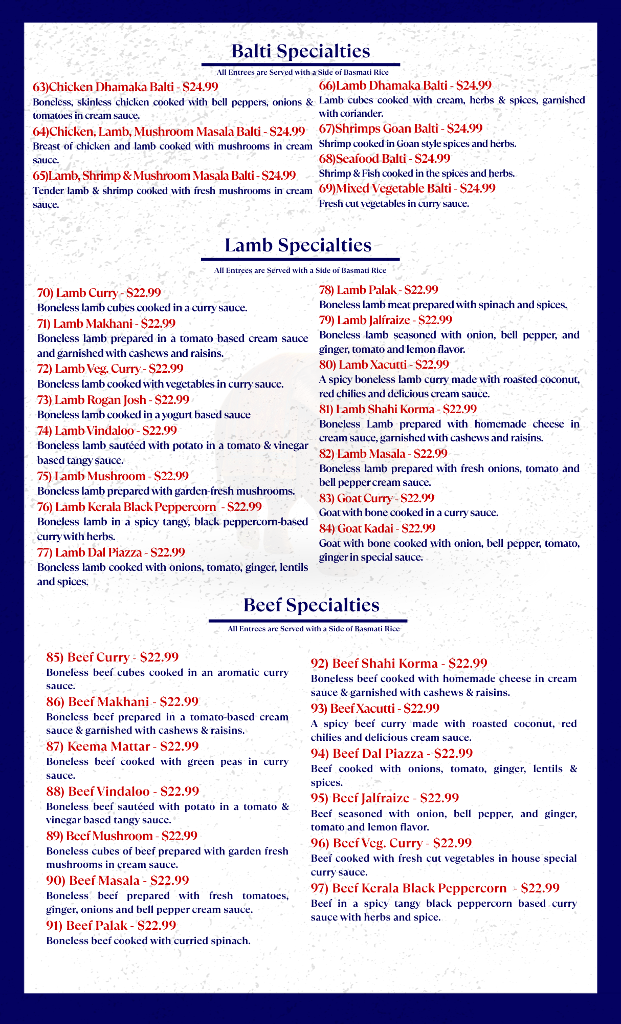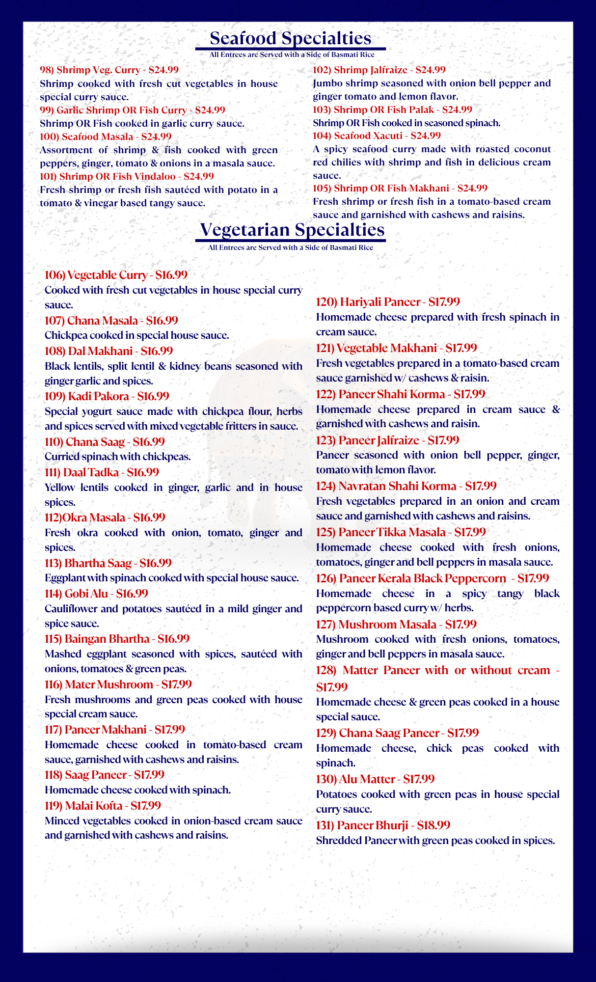 Our Menu Welcome to Tandoor of India, where time-honored Indian recipes meet bold spices and fresh ingredients. Each dish is prepared with care, tradition, and a passion for authentic flavor. We invite you to explore, enjoy, and savor every bite.